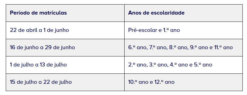 Calendário de matrículas do ano letivo 2026/2027