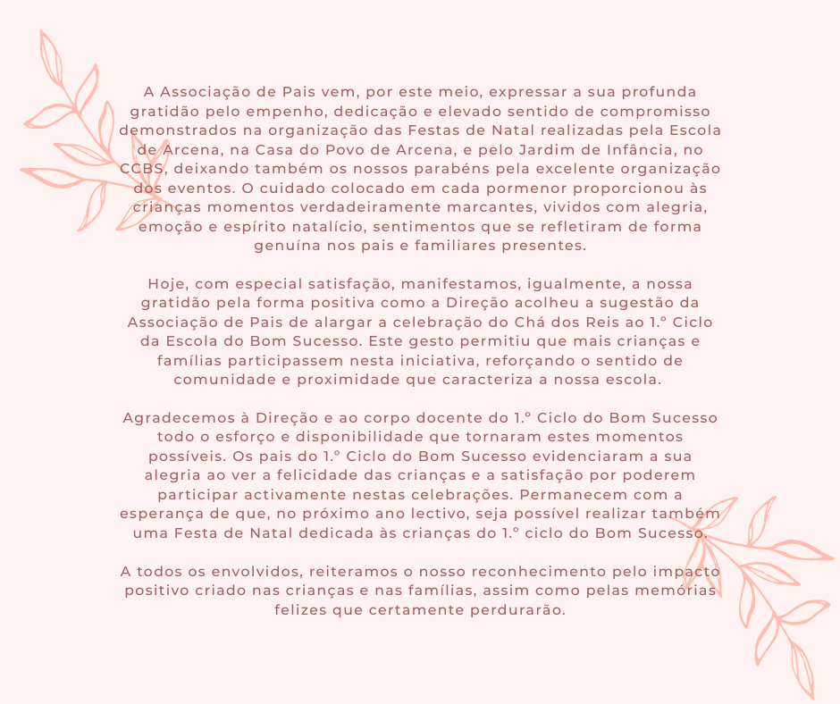 Estas ações só foram possíveis graças ao envolvimento e apoio de todos os pais e encarregados de educação, que confiam e colaboram com a nossa Associação. Continuamos comprometidos em contribuir ativamente para o enriquecimento do percurso escolar dos nossos alunos, sempre com o objetivo de construir uma escola mais dinâmica, inclusiva e estimulante.